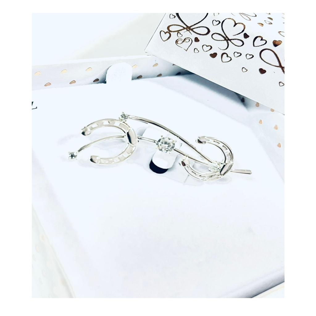 Embrace equestrian elegance with this silver-plated Horseshoe and Cubic Zirconia brooch. Perfect for horse enthusiasts, this elegant brooch features two horseshoes and cubic zirconias. Designed in the UK. Lead-free, nickel-free.