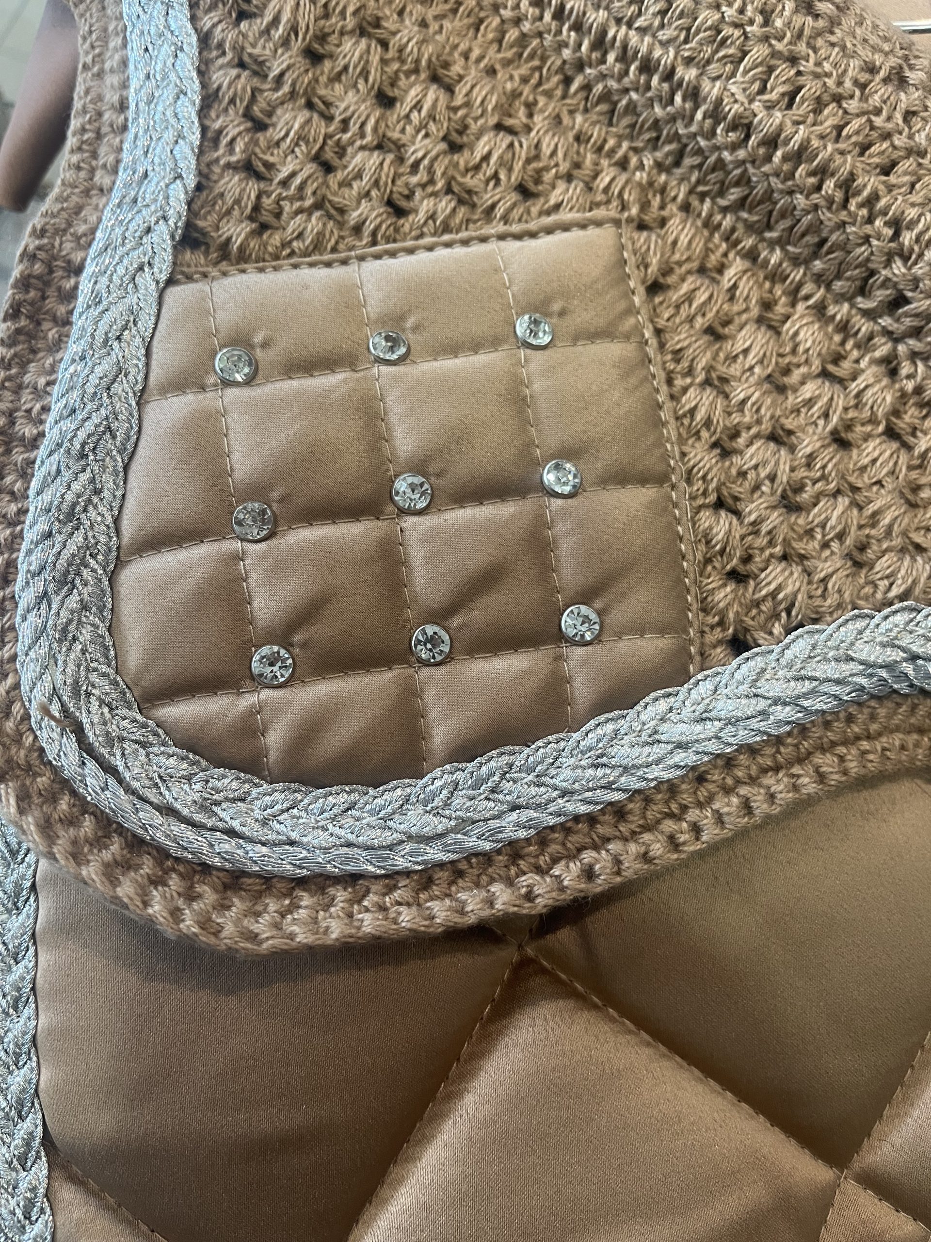 The EquiStyle Lamia Ear Veil is designed in in a luxurious crocheted fabric with a diamante decorated quilted satin patch.  Styled with a silver cord and finished with soft, comfortable lycra ear fabric for a secure fit under the bridle. Ideal for the competition rider the ear veil provides protection against pesky insects and provide adequate noise reduction.