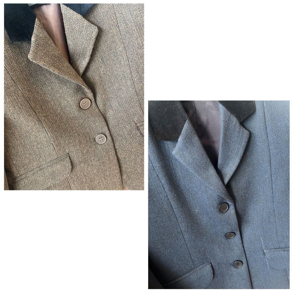 The deep navy and rich brown tweed are timeless and versatile, easily pairing with your existing equestrian wardrobe. The jacket features a refined cut that flatters the figure, with imitation pockets that maintain a sleek and elegant silhouette. A luxurious velvet collar adds a touch of class, while the double vent at the back allows for free and unrestricted movement, essential for jumping and riding with ease.